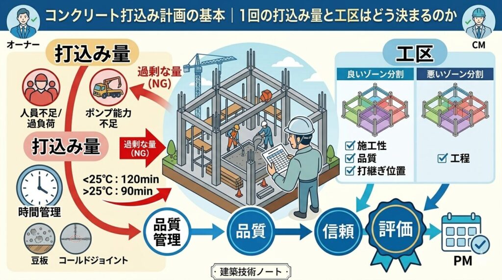 コンクリート打込み計画の基本|1回の打込み量と工区はどう決まるのか