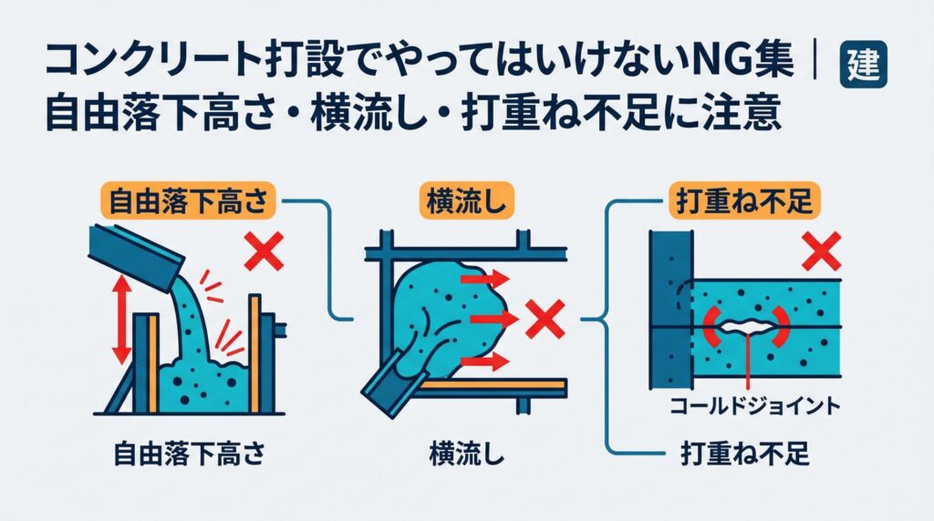 コンクリート打設でやってはいけないNG集|自由落下高さ・横流し・打重ね不足に注意
