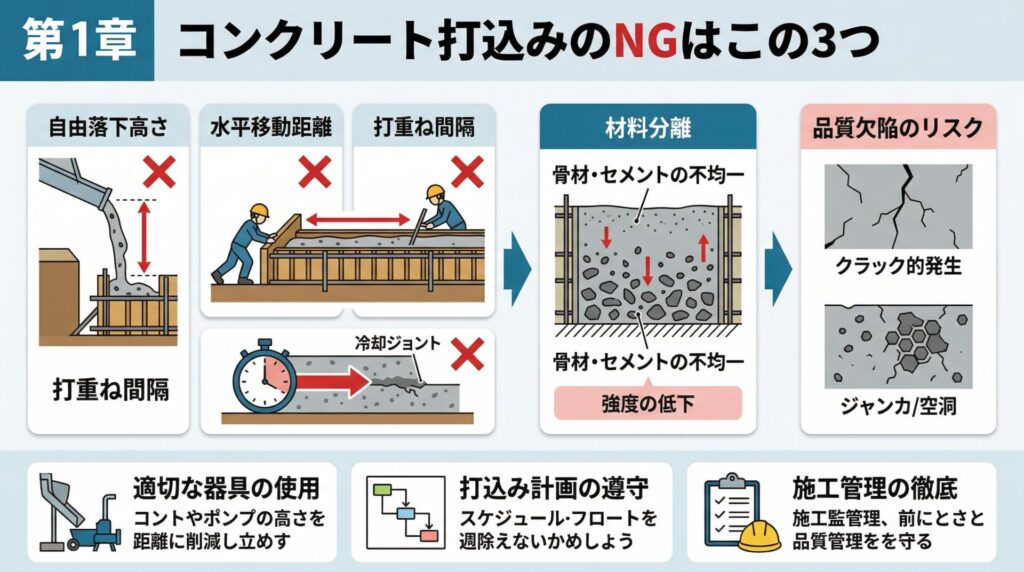 コンクリート打設でやってはいけないNG集|自由落下高さ・横流し・打重ね不足に注意