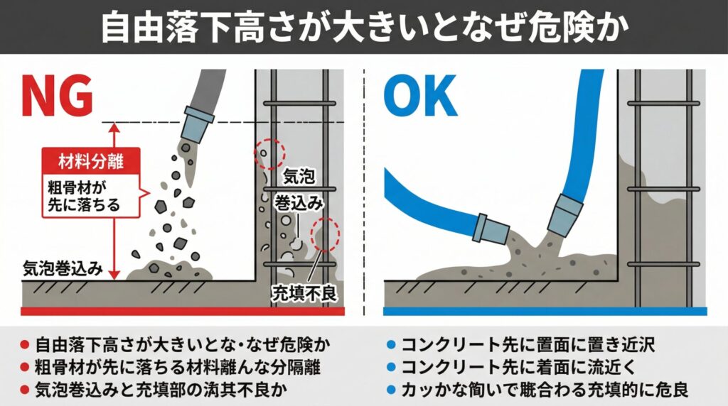 締固め不足と材料分離を同時に招きやすく、結果として密実性が落ちます。