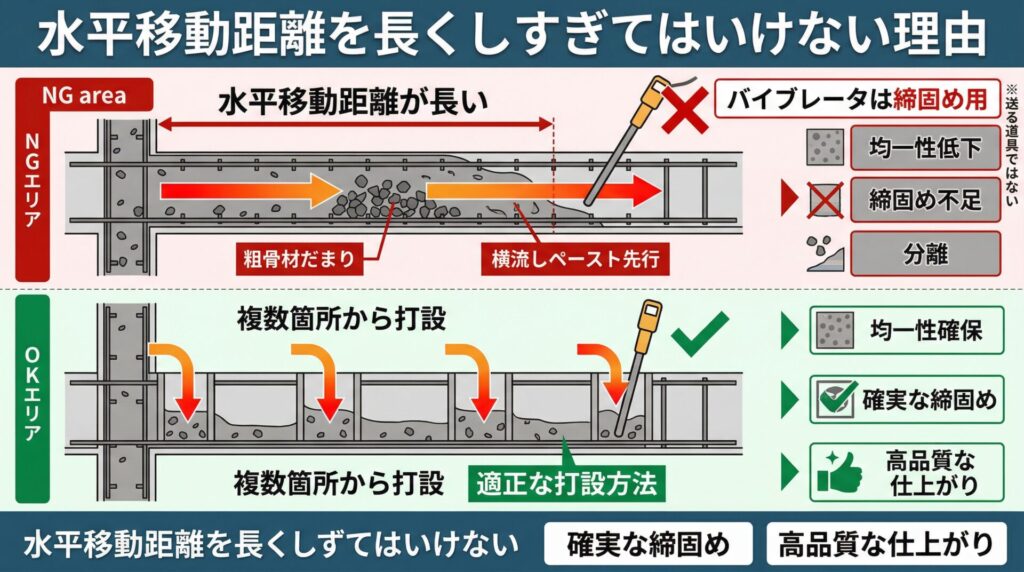 • 水平移動距離が長いと、粗骨材とペーストの偏り、締固め不足、均一性低下につながりやすい。