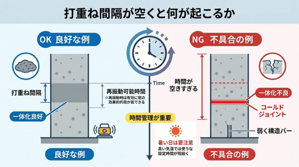 国交省の品質確保資料でも、適正な時間間隔を過ぎて打ち重ねると、前後のコンクリートが一体化しない状態となり、打ち重ね部にコールドジョイントが生じると説明されています。