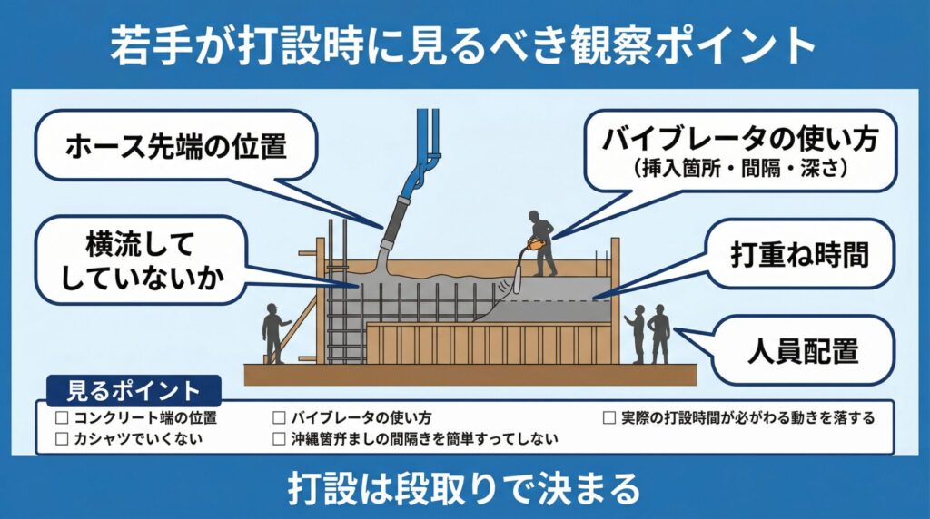 若手が現場で打設を見るとき、全部を完璧に理解する必要はありません。
