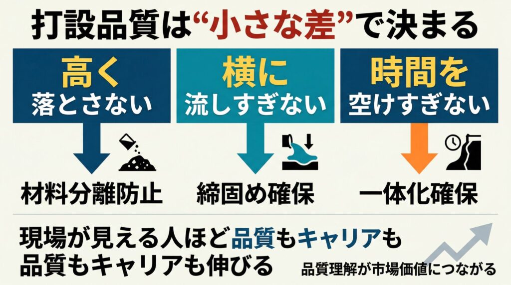 つまり、打込みは“入ればよい”ではなく、“分離させず、一体化させ、密実にする”ことが本質です。