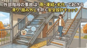 今回は、外部階段等の手すりに関する設計上の留意点と具体的な対策案について、法規制や任意基準を基に考えます。
