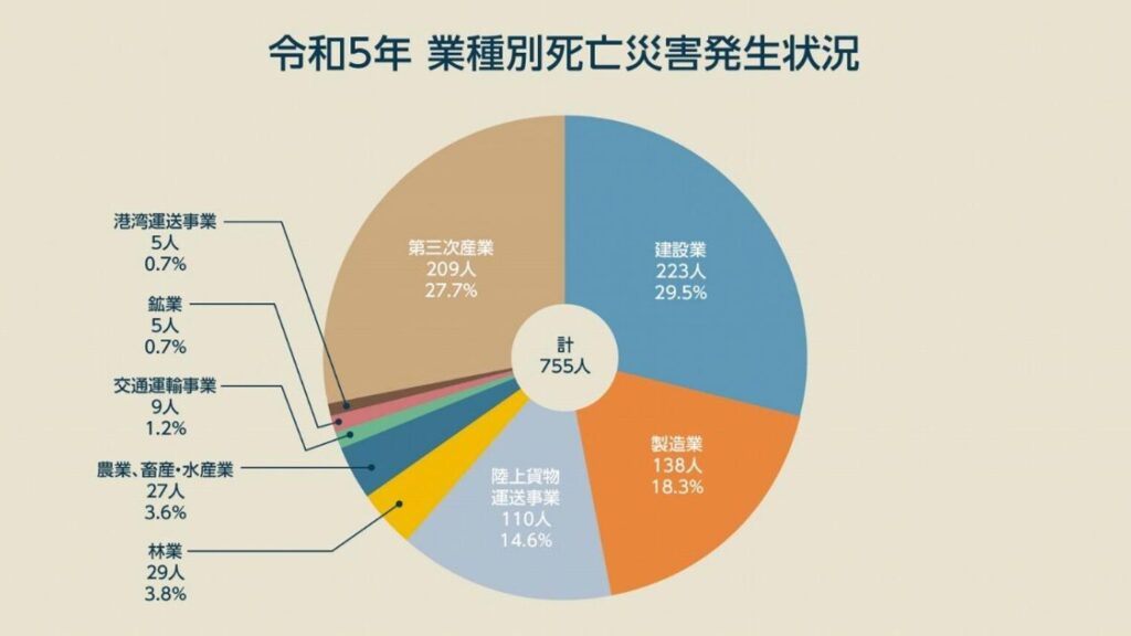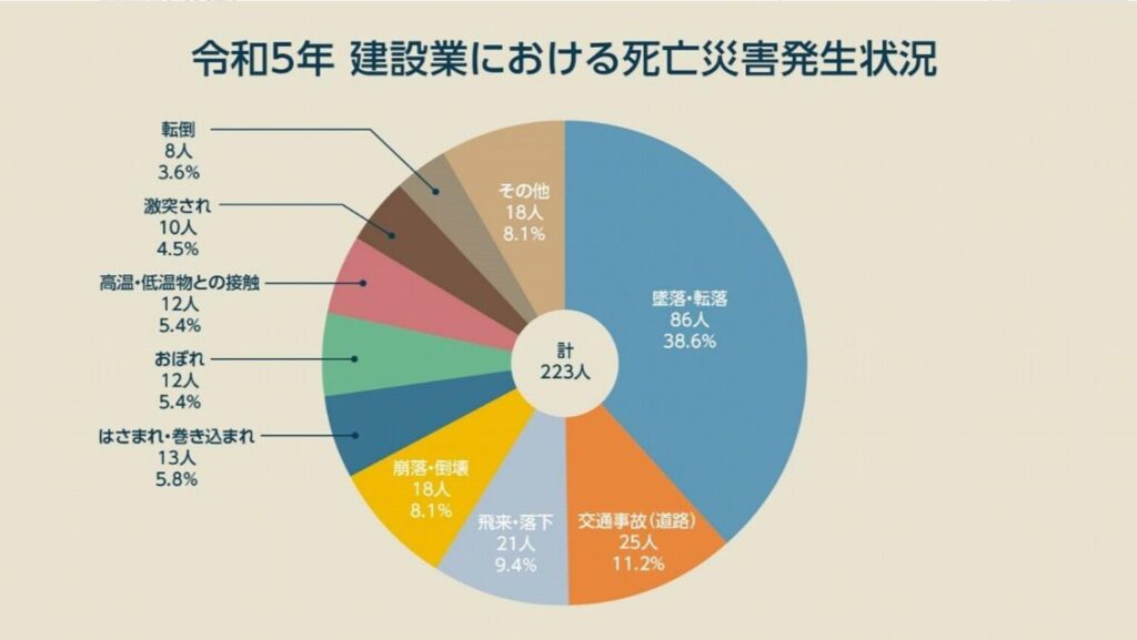 実際、厚生労働省の統計(令和5年)では建設業の死亡者223人中、墜落・転落による死亡者は86人(約38.6%)で最多となっています。