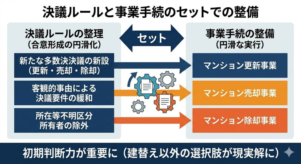 • 今回の改正は、決議ルールと事業手続をセットで整えている。