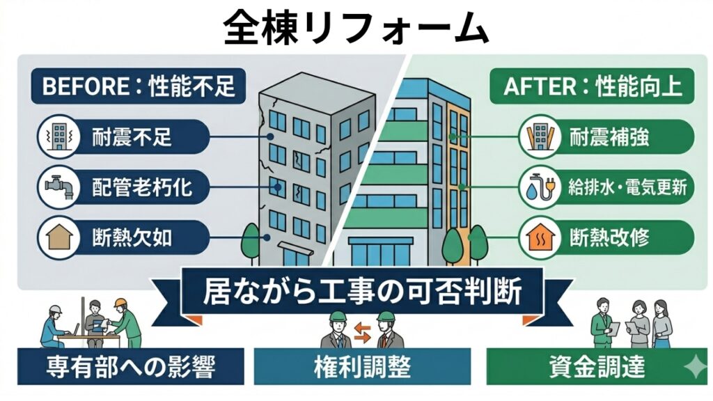 場合によっては専有部分まで含めた全面改修を行います。