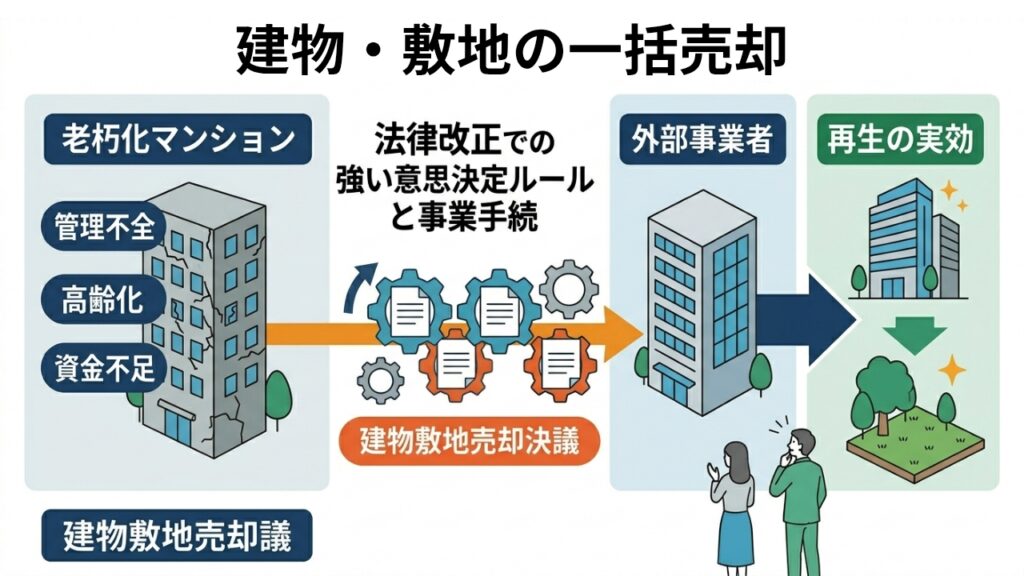 • 一括売却は、再生の担い手を住民側から外部事業者へ移す手法。