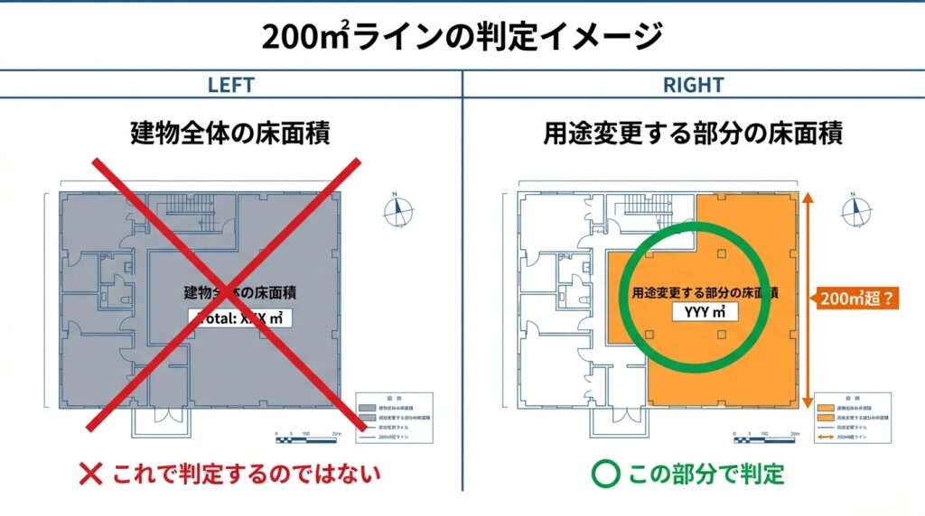 - 200㎡は「建物全体」ではなく、基本は用途変更する部分で判定。