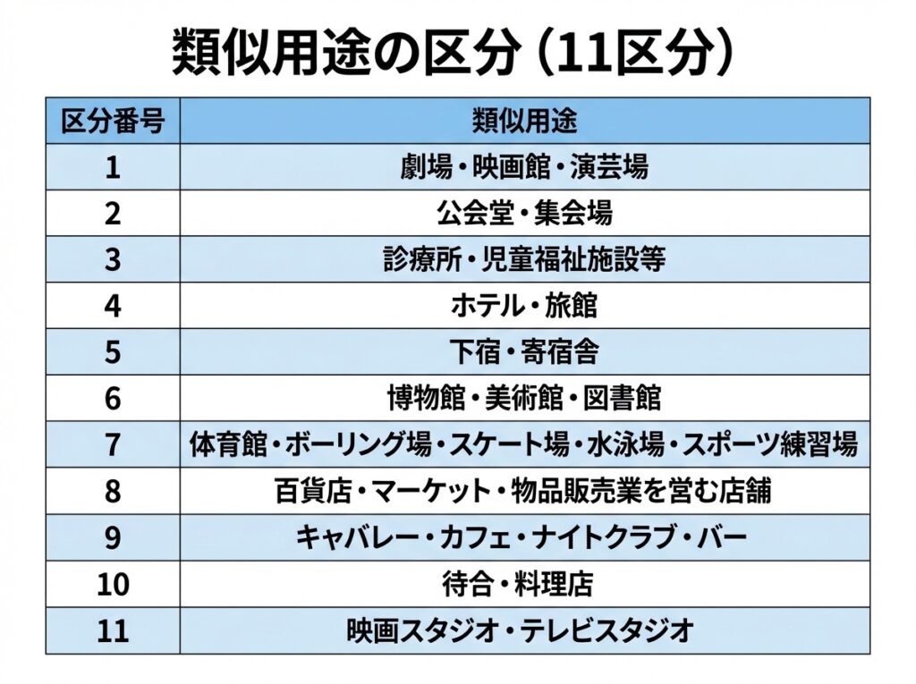 - 類似用途は自治体資料が「11区分」で整理しており、当てはめに使える。