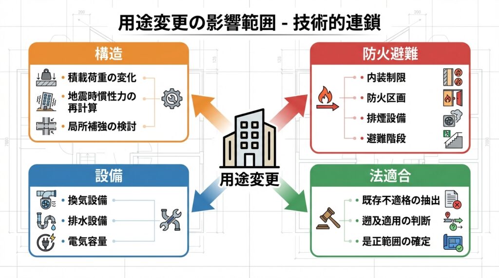 - 用途変更は 荷重・防火避難・設備がセットで動く。
