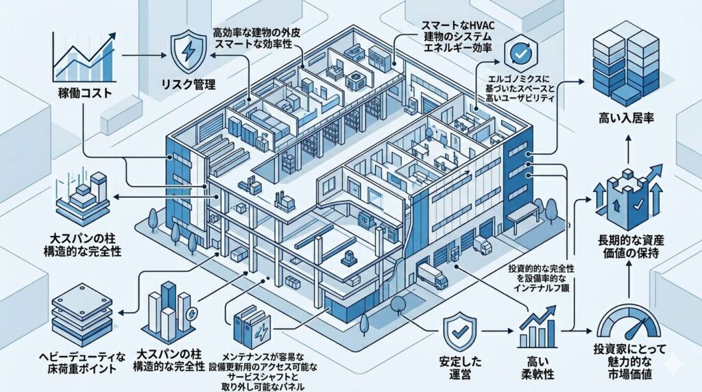 こうした要素が、再リーシングのしやすさ、CAPEXの読みやすさ、稼働率の安定、売却時の評価に効いてきます。