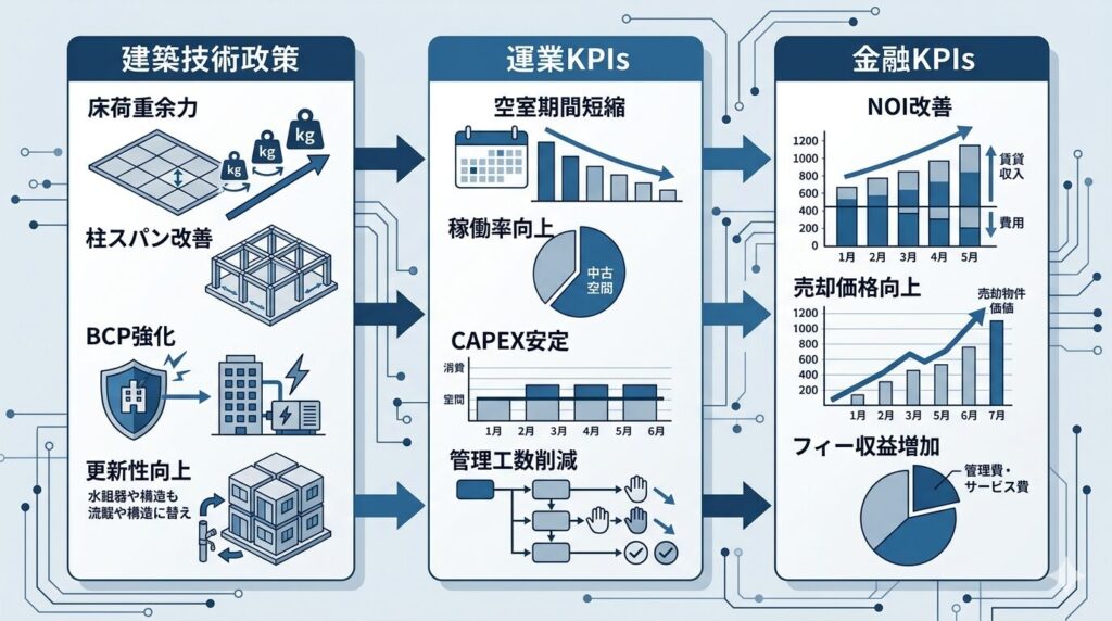 - 空室期間、CAPEX、PML、DD指摘件数などは、技術と収益をつなぐ重要な指標である。